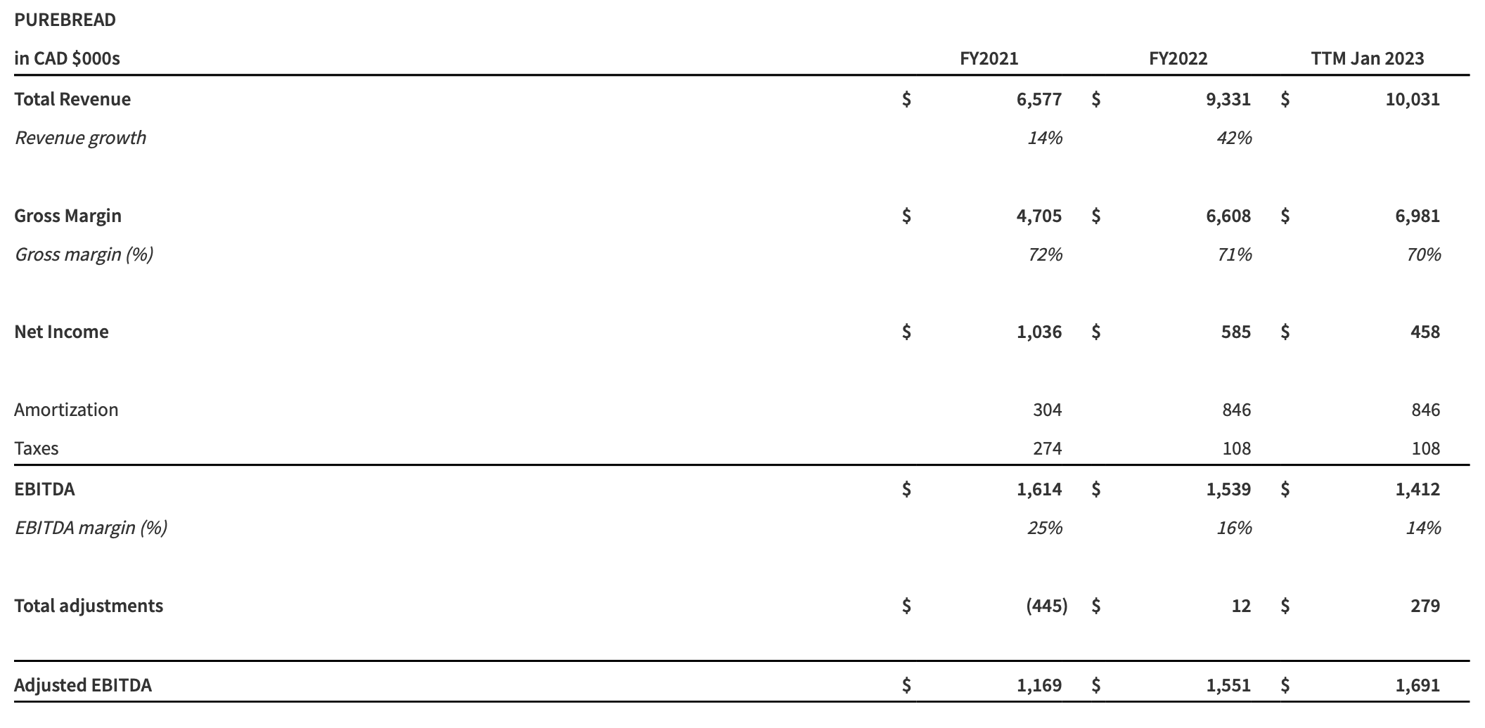 Purebread is one of Canada's most respected independent retail brands with exceptional customer loyalty. Currently, Purebread has six operating locations which generated the following unaudited financial results for the trailing 12 months ended January 31, 2023: