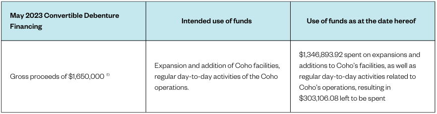 The most recent audited annual financial statements and interim financial report of the Company included a going concern note. The Company is a growth stage company and the Company has not yet generated positive cash flows from its operating activities, which may cast doubt on the Company’s ability to continue as a going concern. The Offering and the Concurrent Offering are intended to facilitate the Acquisition. While Coho’s management believes that the Offering, Concurrent Offering, and Acquisition are in the best interests of the Company, these transactions are not expected to affect the decision to include a going concern note in the next annual financial statements of the Company.