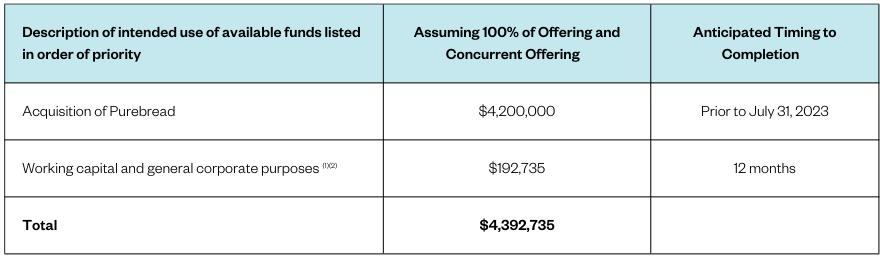 (2) On May 29, 2023, the Company announced that it had entered into a purchase agreement to acquire all (100%) of the issued and outstanding securities of Purebread. Given the immediate positive impact on the Company’s revenue and net income due to Purebread’s existing profitable operations, in addition to Purebread’s latest location opening on June 14, 2023 at the Vancouver International Airport, management firmly believes that the Company’s working capital needs will be well-funded and maintained by the combined operations of the Company and Purebread over the next 12 months. As a result, the amount allocated for working capital and general corporate purposes as part of this Offering is sufficient.