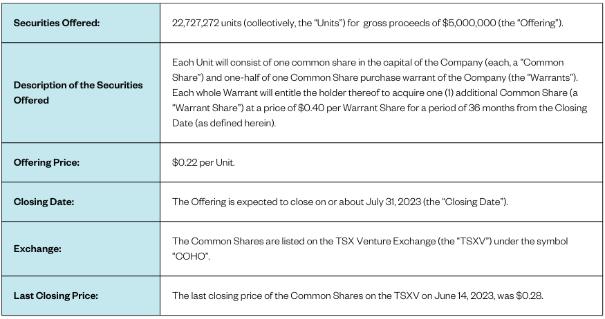 Coho, is conducting a listed issuer financing under section 5A.2 of National Instrument 45-106 Prospectus Exemptions (“NI 45-106”). In connection with this Offering, the Company represents the following is true: