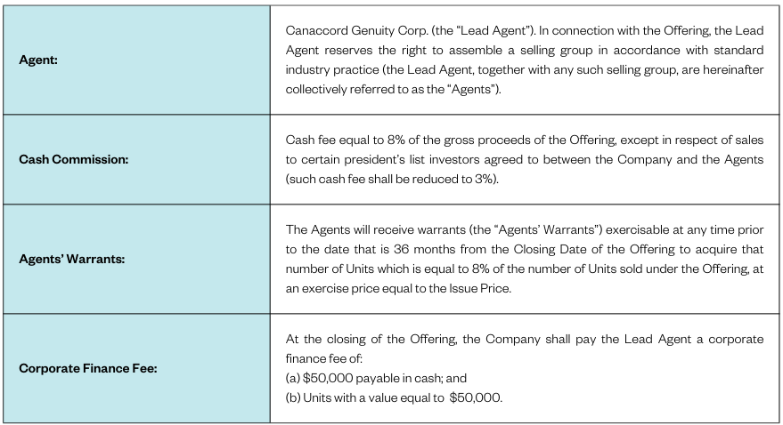 (5) The cash fee payable to the Agents shall be reduced to 3% for certain president’s list investors under the Offering and the Concurrent Offering (the “President’s List”). Figures provided above assume no subscribers will appear on the President’s List, which would reduce the fees payable by the Company to the Agents.